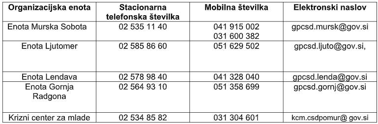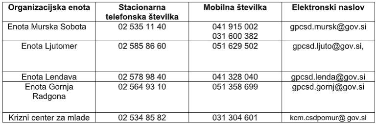 Vse uporabnike naprošajo, da CSD obiščete samo v nujnih primerih. V okvir nujnih nalog spadajo ukrepi za varstvo koristi otrok po Družinskem zakoniku, neodložljive naloge po Zakonu o preprečevanju nasilja v družini ter ostale naloge, kjer je nujna takojšnja zaščita osebe.