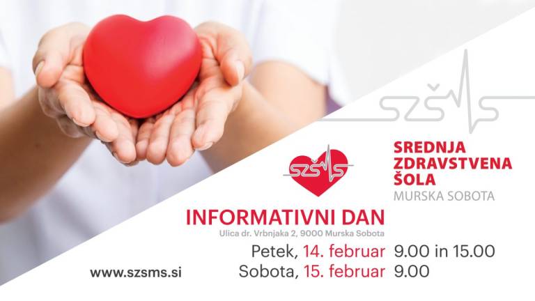 Srednja zdravstvena šola Murska Sobota vabi na informativne dneve, ki bodo potekali v petek, 14. februarja 2025, ob 9. in 15. uri, ter v soboto, 15. februarja 2025, ob 9. uri.
