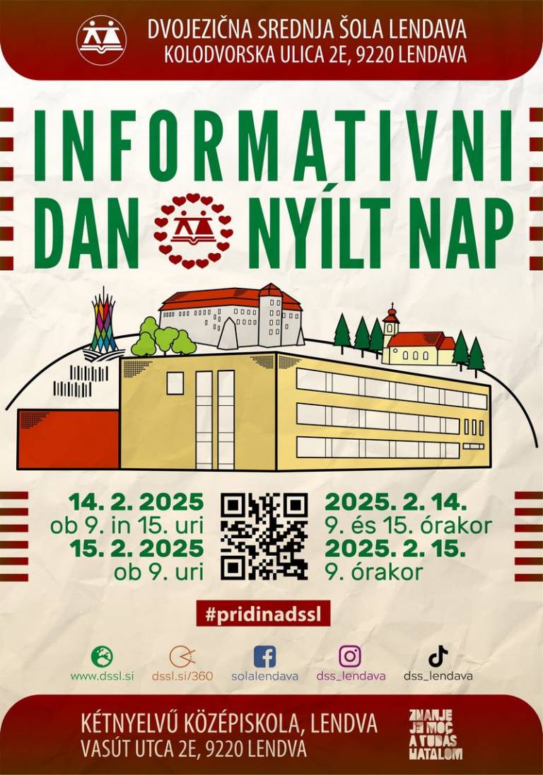 Dvojezična srednja šola Lendava vabi bodoče dijake na informativne dneve, ki bodo potekali v petek, 14. februarja 2025, ob 9. in 15. uri, ter v soboto, 15. februarja 2025, ob 9. uri.