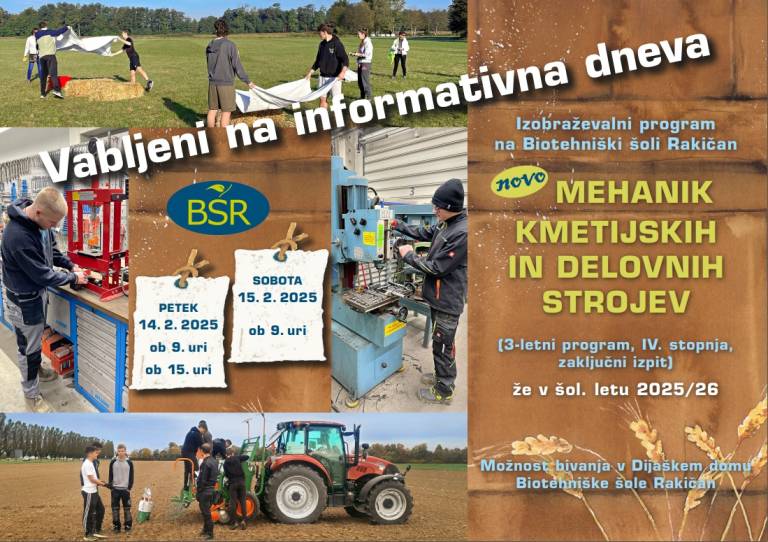 Biotehniška šola Rakičan vabi na informativne dneve, ki bodo potekali v petek, 14. februarja 2025, ob 9. in 15. uri, ter v soboto, 15. februarja 2025, ob 9. uri.