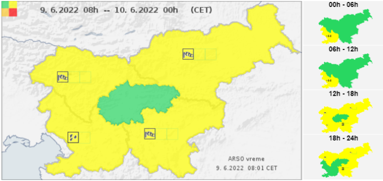 Rumeno opozorilo pa je izdano za skorajda celo Slovenijo, razen osrednjo. Močan veter bo pihal na severovzhodu, jugovzhodu in severozahodu. Na jugozahodu bodo še neurja.