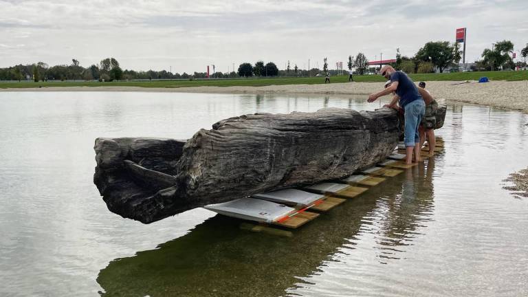 Po besedah Branka Kermana, direktorja Pomurskega muzeja Murska Sobota bodo čoln deblak na dno jezera potopili šele prihodnji teden.