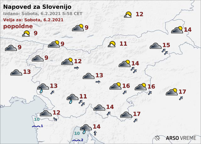 Dež se bo dopoldne na zahodu okrepil in se čez dan razširil na večji del Slovenije, najmanj ga bo v vzhodnih krajih. Pihal bo južni veter, ob morju okrepljen jugo. Najnižje jutranje temperature bodo v severni Sloveniji okoli 4, drugod od 7 do 11, najvišje dnevne od 5 do 12, ob morju in na severovzhodu do 14 stopinj Celzija.