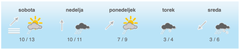 Predvsem v hribovitih krajih na zahodu bo občasno rosilo ali rahlo deževalo. Pihal bo šibak do zmeren jugozahodnik. Najvišje dnevne temperature bodo od 9 do 14, na vzhodu do okoli 16 stopinj Celzija.