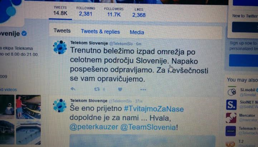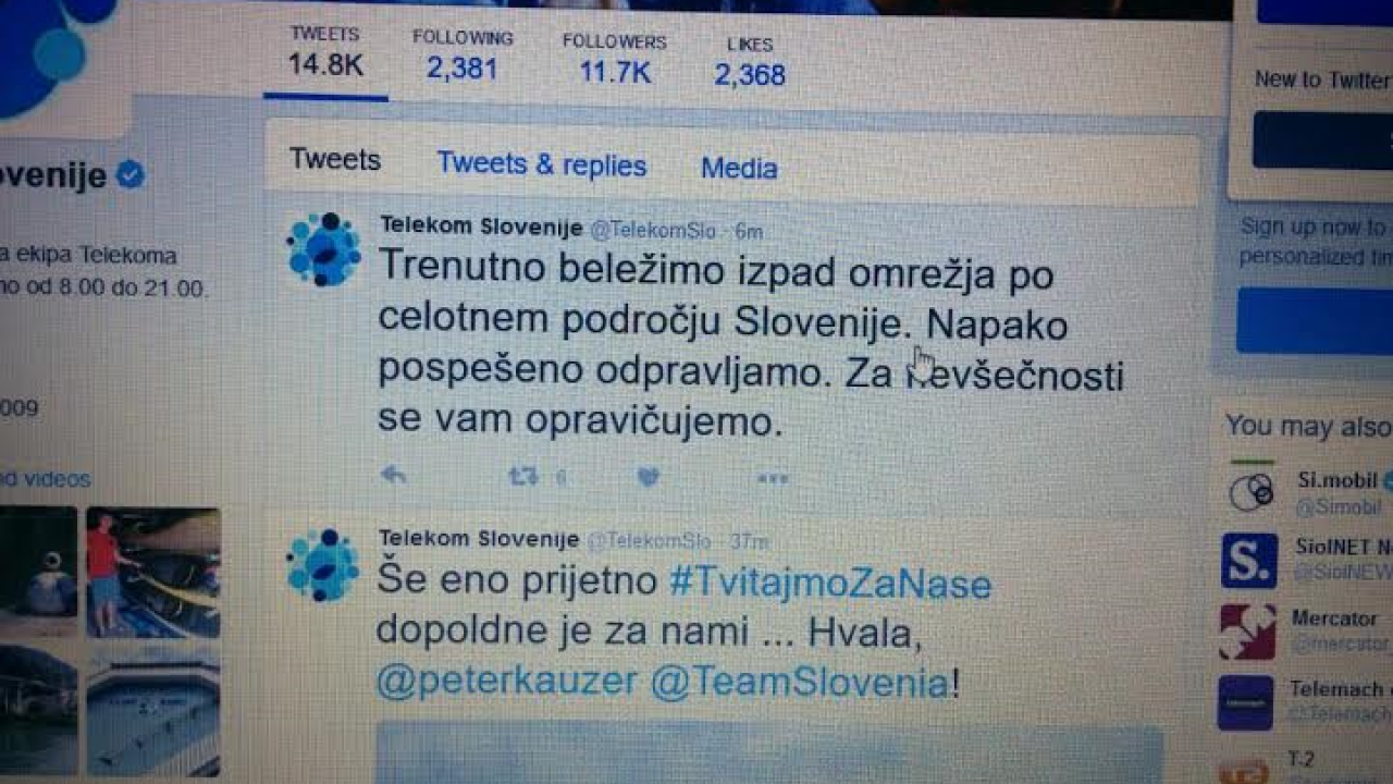 Telekom Slovenije je sporočil, da trenutno beležijo izpad omrežja po celotnem področju Slovenije.