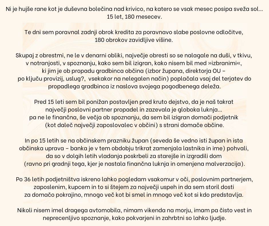 Še posebej boleče pa mu je, da se isti župan, ki je bil po njegovih besedah del takratnih odločitev, danes na občinskih proslavah hvali z dosežki – tudi s projekti, ki so bili po njegovih besedah povezani z omenjenimi finančnimi luknjami.