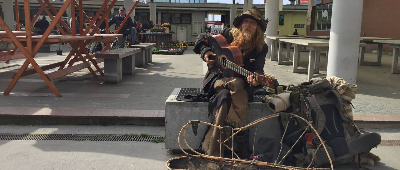 Popotnika smo srečali na soboški tržnici, kjer je dopoldne igral kitaro, da bi si prislužil kakšen evro prostovoljnih prispevkov. Pojasnil nam je, da je prenočil na prostem, v mestnem parku. Po jutranjem obisku policistov, ki so bili sicer korektni, je dobil tudi kavo in zajtrk v pekarni.