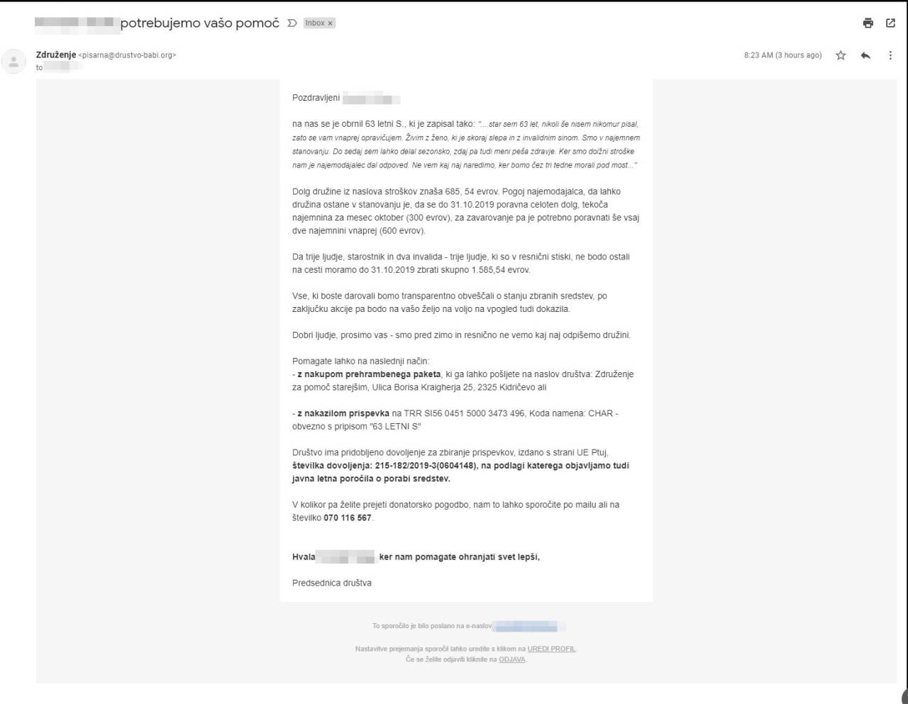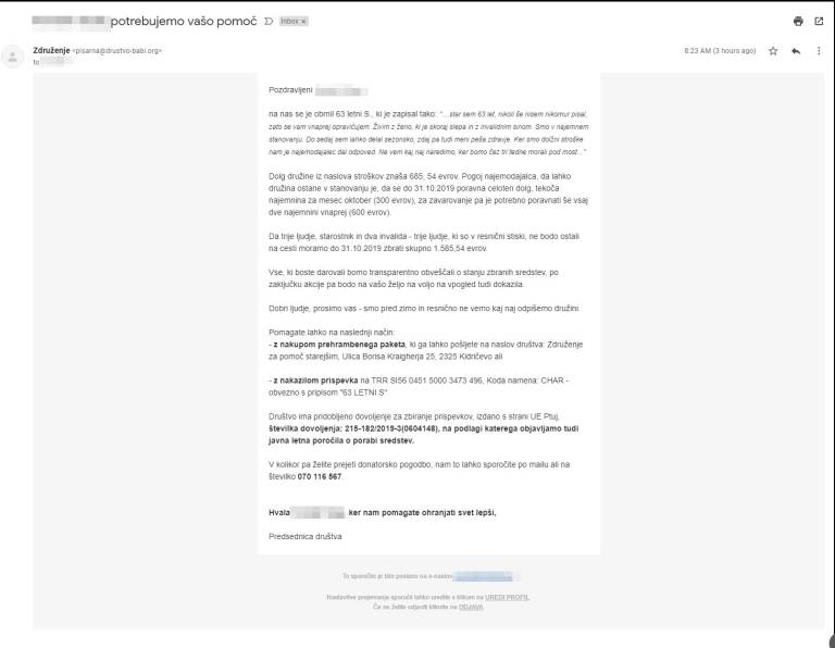 Tako Društvo za pomoč starejšim Babi, z naslovom v Kidričevem, začenja e-sporočilo, ki je danes zaokrožilo po e-naslovih številnih Slovencev. Na prvi pogled srce parajoča zgodba, pa je temu res tako?