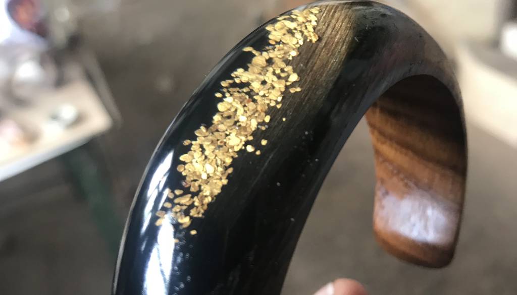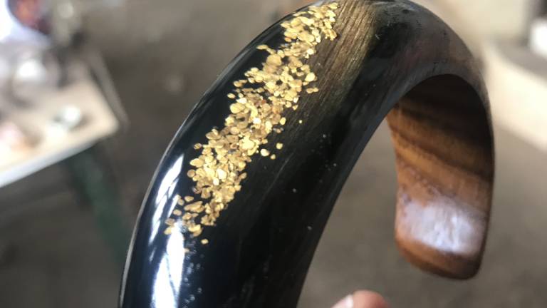 Zapestnica iz kolekcije Dravagold vsebuje pa 120 miligramov zlata, kar je približno tisoč zlatih luskic. Da Sašo in Srečko iz Drave na starodaven način izpereta toliko luskic, potrebujeta en dan.