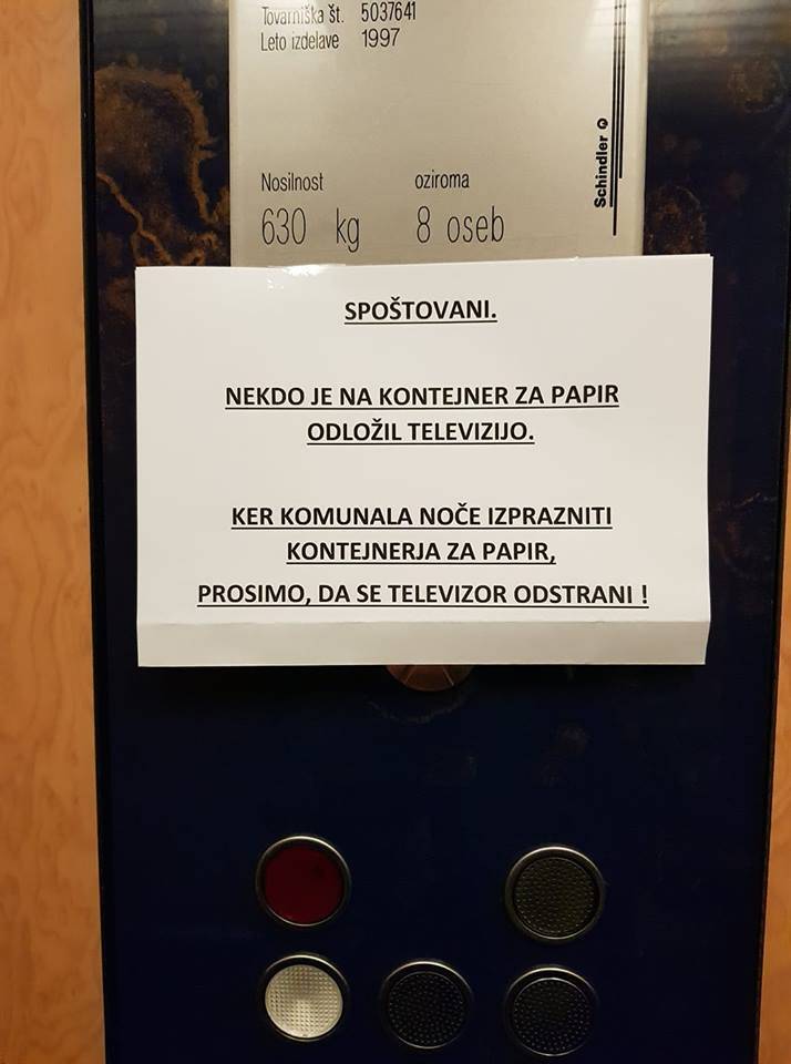 Na težavo zdaj opozarja sporočilo v dvigalu, s katerim stanovalce stanovanjskega bloka pozivajo k odstranitvi televizorja, zgodba pa je poskrbela tudi za zgražanje uporabnikov na družbenih omrežjih.