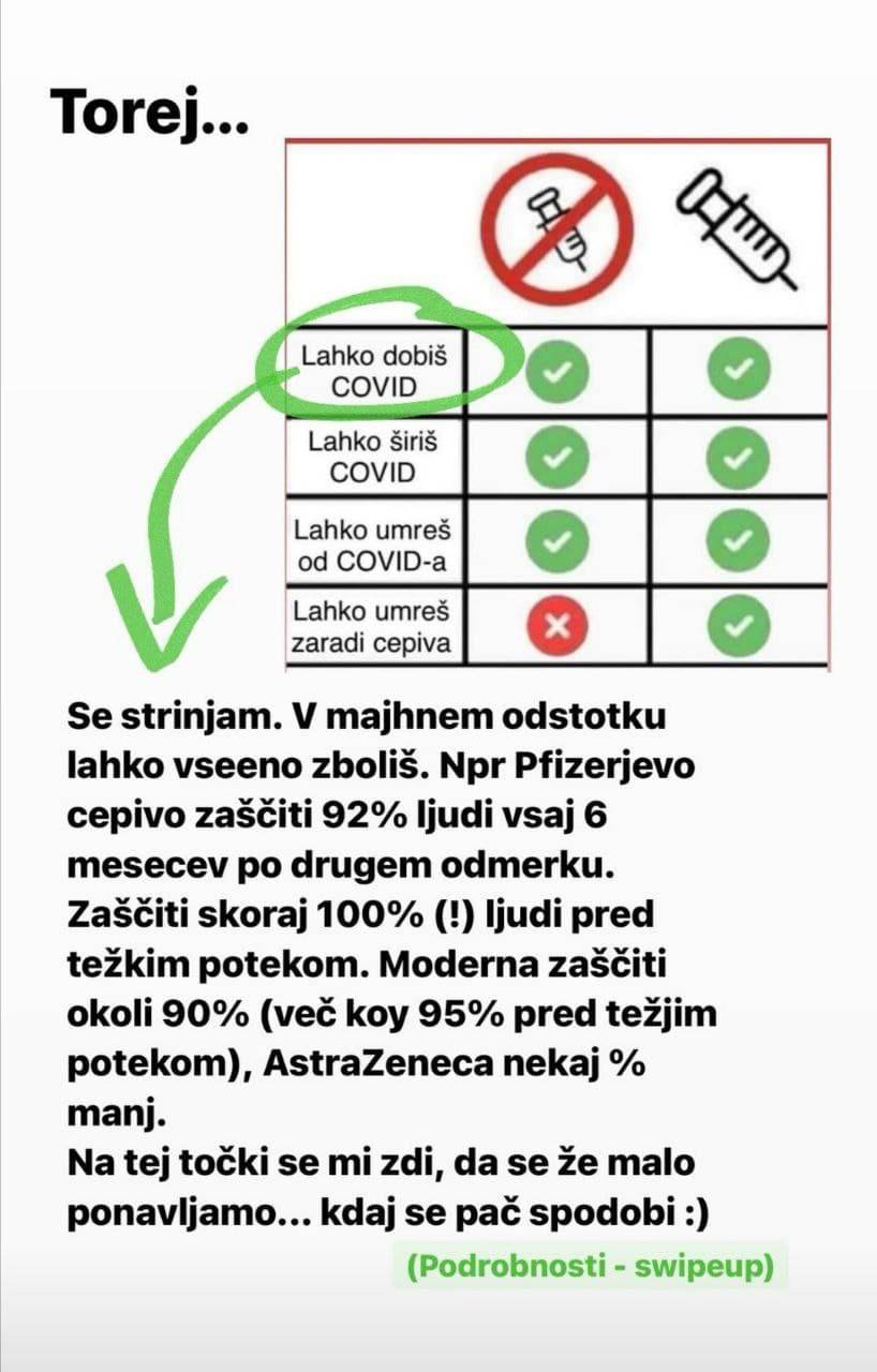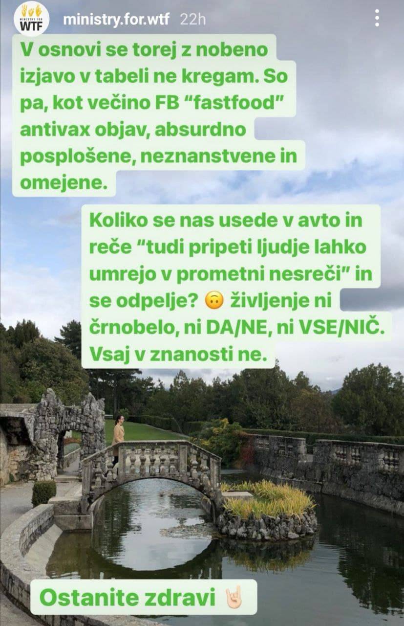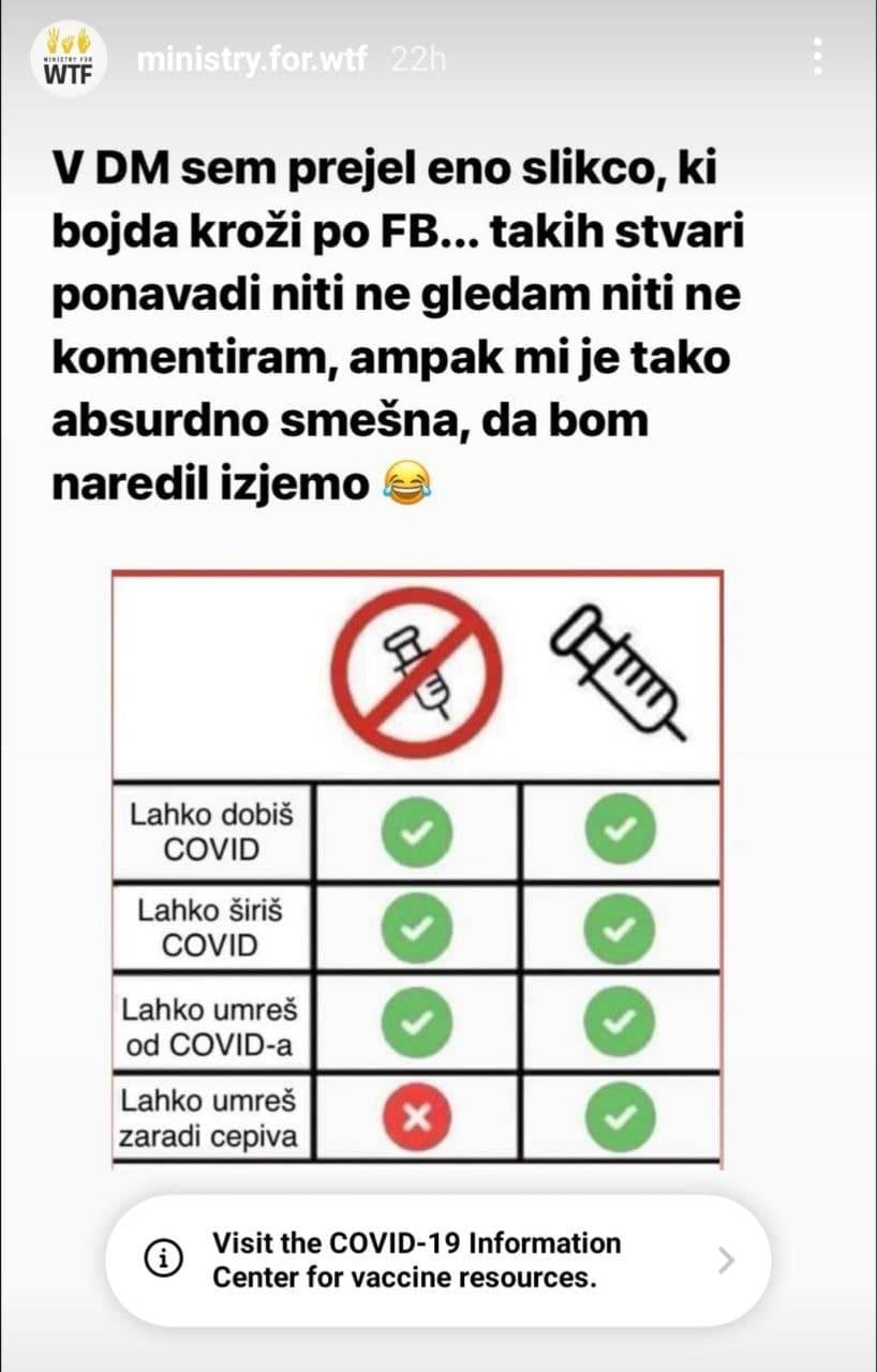 Na Instagram profilu ministry.for.wtf deli svoja strokovna mnenja, redno pa se dotakne tudi teme cepljenja. Komentiral je članek, v katerem je naštetih 18 razlogov proti cepljenju.