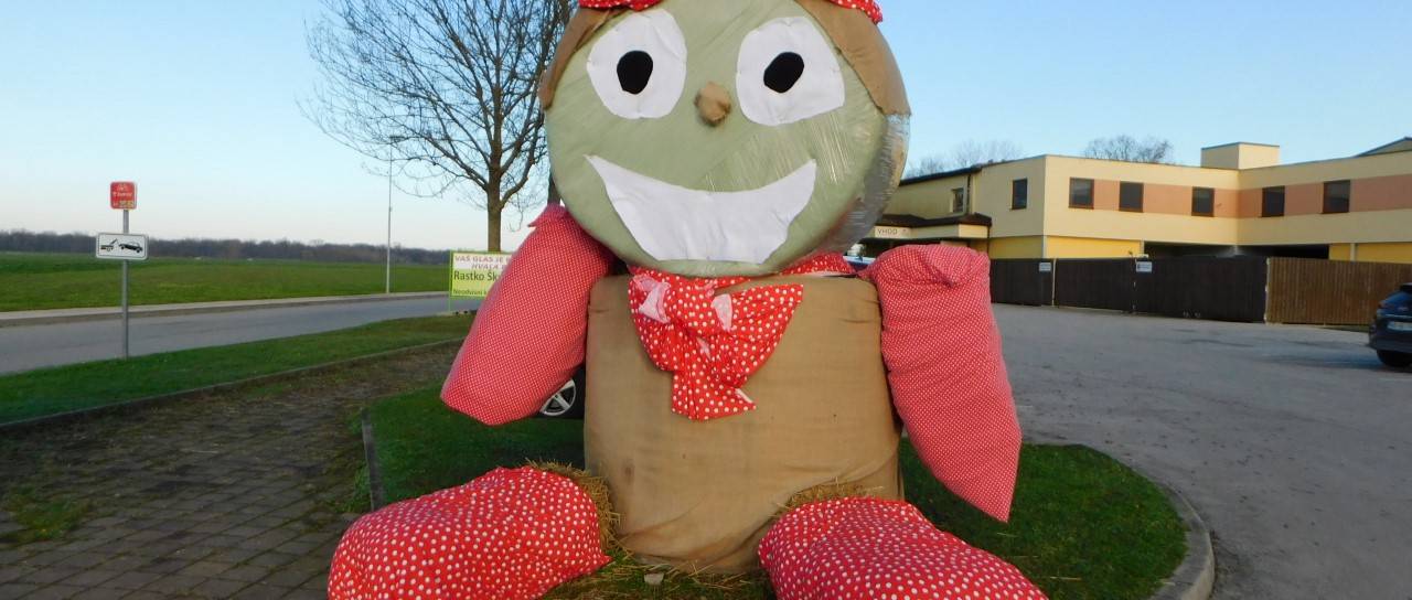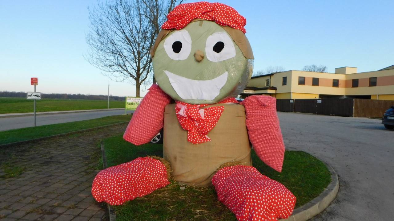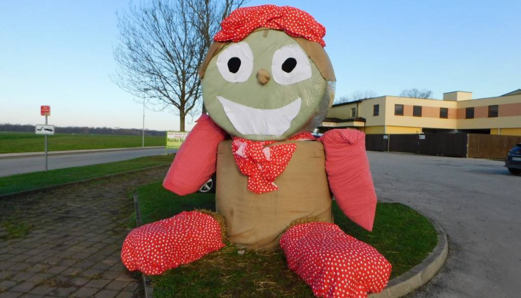 Domačini iz Banovcev so prispevali bale slame in tako omogočili nastanek idilične maskote, ki razveseljuje mimoidoče obiskovalce.