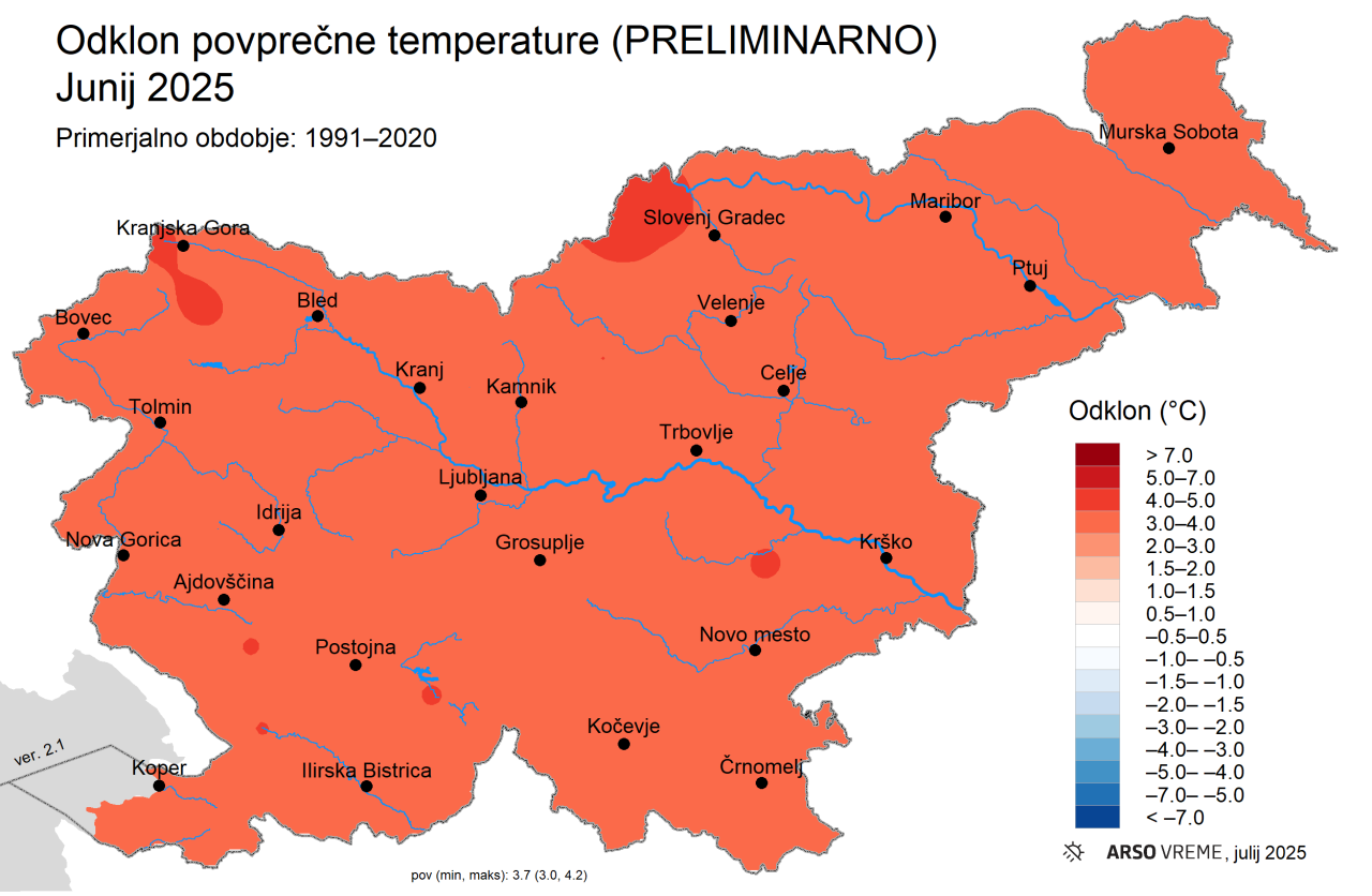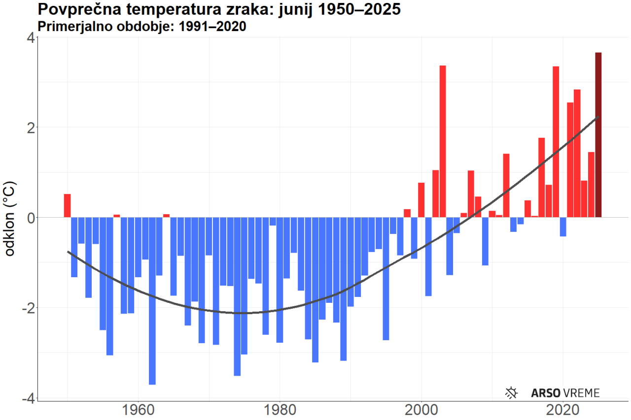 Odklon povprečne temperature glede na obdobje 1991–2020 je znašal plus 3,7 stopinje Celzija, s čimer je junij 2025 prehitel do zdaj rekordna junija 2003 in 2019