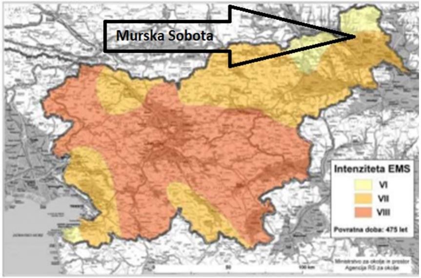 Iz karte potresne intenzitete Slovenije je razvidno, da je severni del Pomurja ogrožen z intenziteto VI, preostali, kamo sodi tudi Mestna občina Murska Sobota, pa z VII.