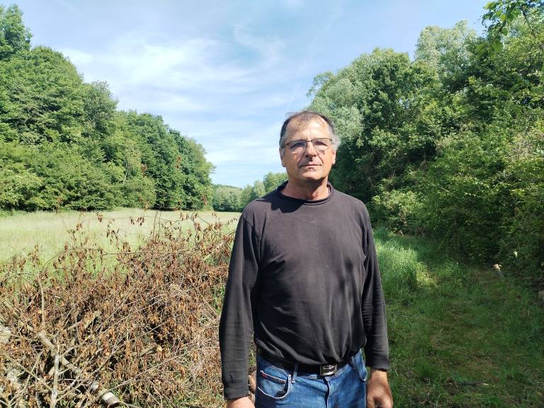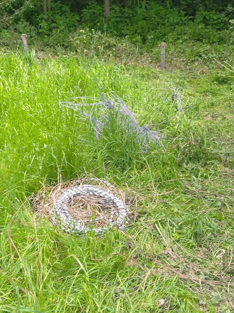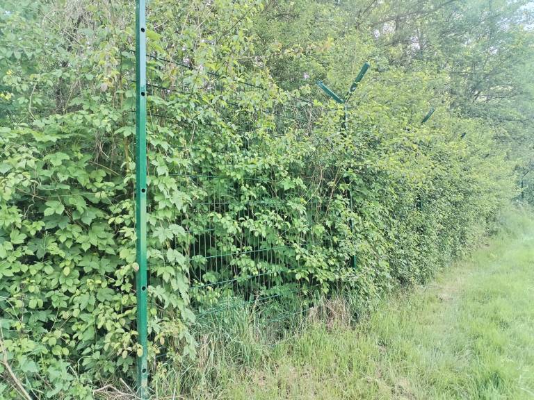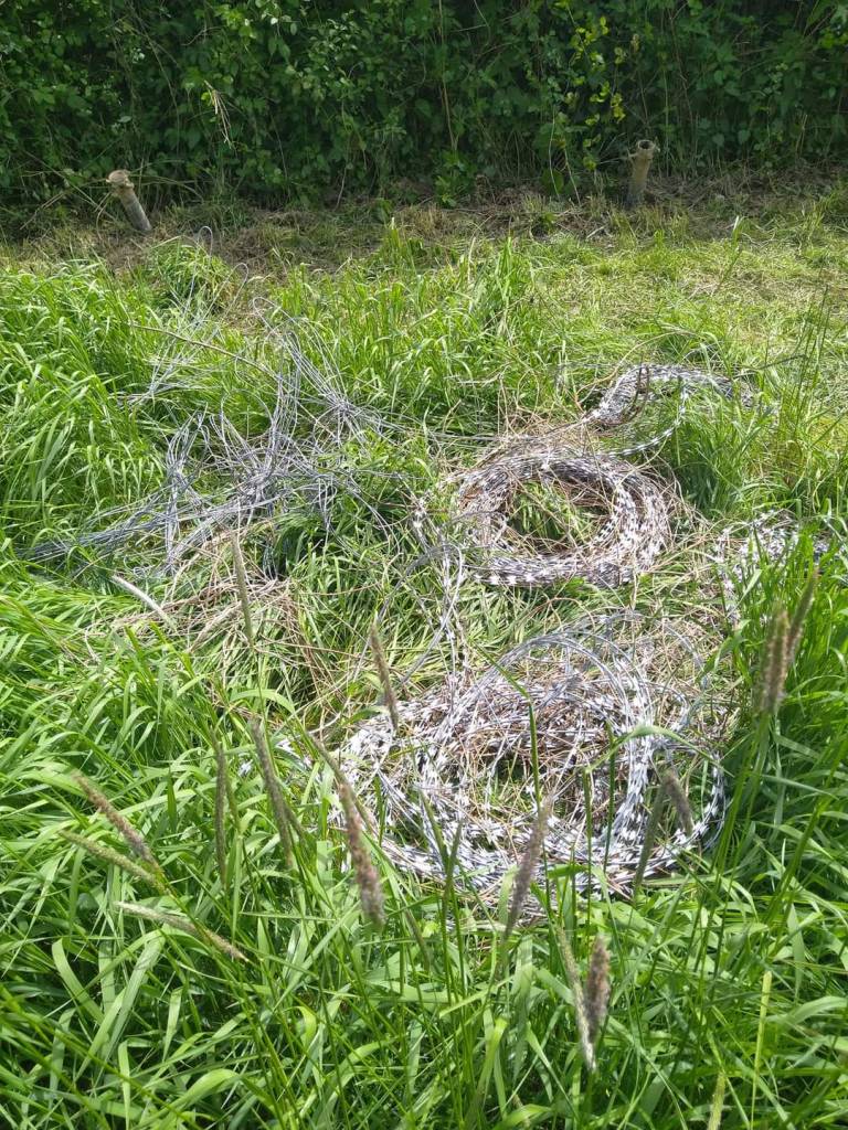 Panelne ograje ni več – ostala je zgolj še rezilna žica, takole prepletena med drevesi in grmovjem – nam pokaže Bogomir Luci, ki poleg državne meje s Hrvaško, v občini Ormož, obdeluje travnik. Ko je minuli teden v travi zagledal kolute žice, ga je zaskrbelo.