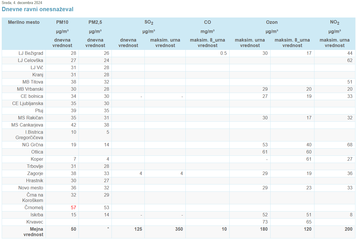 Podatki kažejo, da so včerajšnje vrednosti delcev PM10 na postaji Cankarjeva dosegle 42 mikrogramov na kubični meter, PM2,5 pa 35 mikrogramov na kubični meter, kar pomeni, da so sprejemljive meje presežene.