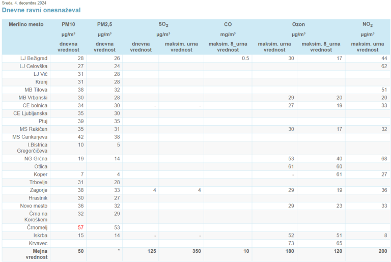 Prav tako visoke vrednosti so bile zabeležene v Rakičanu, kjer je PM10 dosegel 35 mikrogramov na kubični meter, PM2,5 pa 31 mikrogramov na kubični meter.