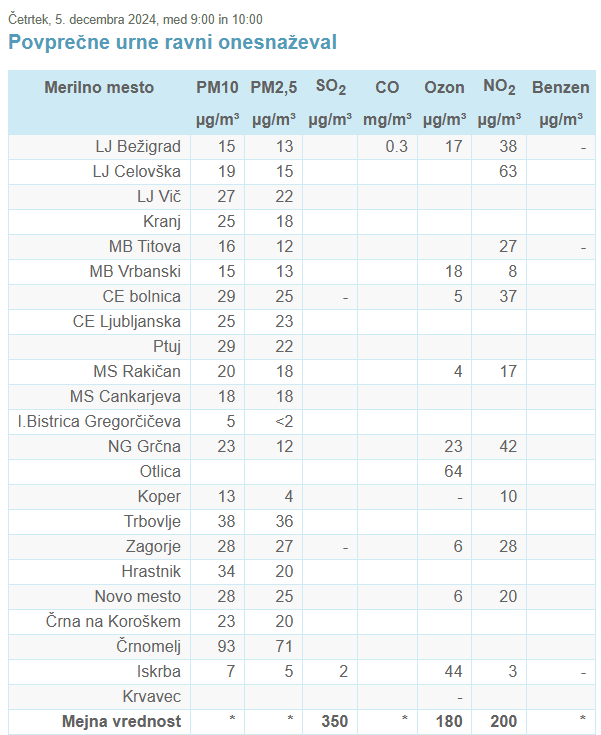 Vrednosti delcev PM10 na postaji Cankarjeva so med 9. in 10. uro dosegle 18 mikrogramov na kubični meter, v Rakičanu pa 20 mikrogramov na kubični meter.