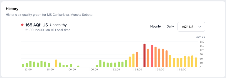 Če primerjamo indeks kvalitete zraka je ta 10. januarja 2025 v Murski Soboti na Cankarjevi ulici dosegel najvišjo vrednost 165, kar je kar za tri indeksne točke več kot v Los Angelesu.