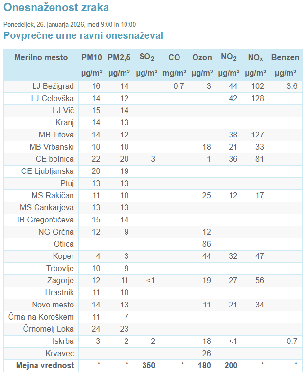 Na merilnih postajah Murska Sobota Cankarjeva je ob 10. uri koncentracija delcev PM10 13 mikrogramov na kubični meter in Murska Sobota Rakičan, kjer so izmerili 11 mikrogramov na kubični meter.
