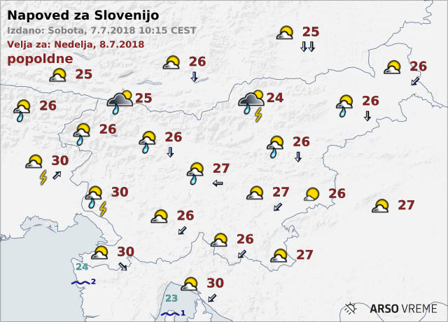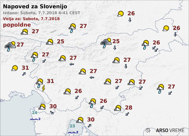 Danes popoldne bo delno jasno s spremenljivo oblačnostjo, obstaja pa tudi možnost nastanka kakšne manjše plohe. Predvsem na vzhodu bo pihal veter severnih smeri, medtem ko bo Primorsko prepihala šibka burja. Najvišje dnevne temperature bodo od 25 do 27 stopinj Celzija.