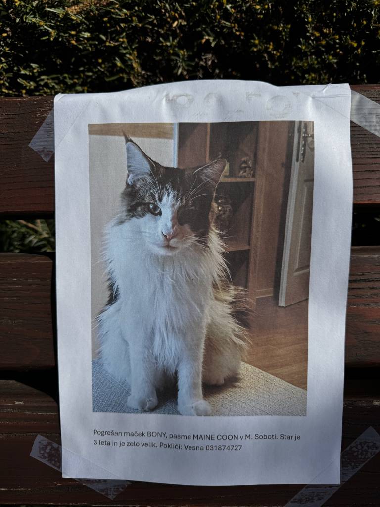 Na območju Murske Sobote je pogrešan maček Bony, pasme Maine Coon. Lastniki so obvestilo o izginotju razširili na terenu, kjer mimoidoče prosijo za pomoč pri iskanju.