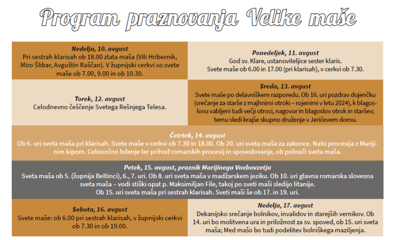Popoldan bo maša pri klarisah ob 15.00, zvečer pa še ob 17.00 in 19.00. V soboto, 16. avgusta, bodo sv. maše ob 6.00 pri klarisah, ter ob 7.30 in 19.00 v cerkvi.
