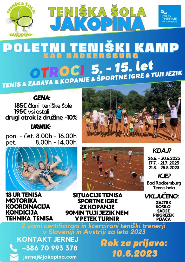 Zanimiv poletni tabor se pripravlja še v Radencih, kjer se obeta Poletni teniški kamp, ki ga organizira Teniška šola Jakopina.