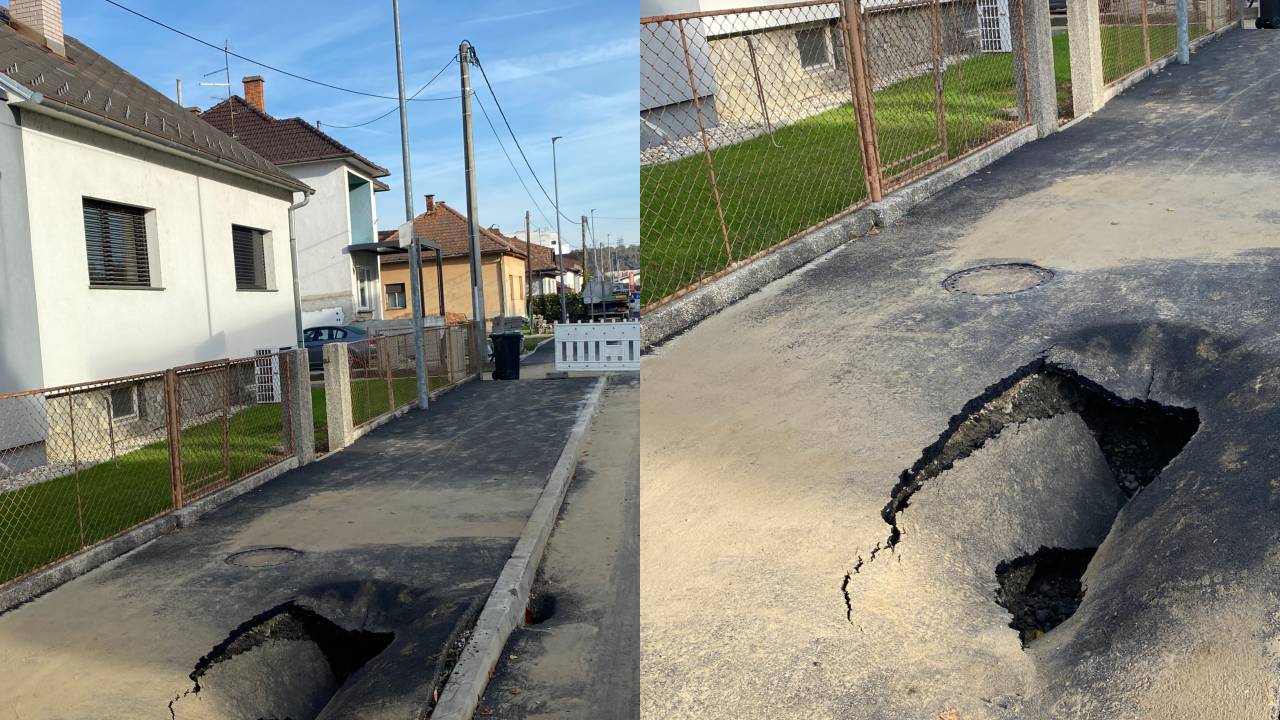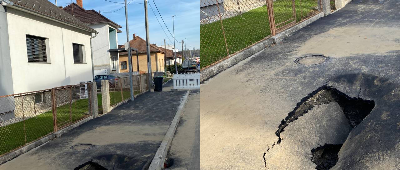 Vendar stroji zaenkrat brnijo le na križišču ulice Štefana Kovača - Mikloša Kuzmiča, kot je razvidno iz fotografij, se namesto odpravljanja poškodb na nedavno asfaltirani ulici kopičijo le še dodatne težave ...