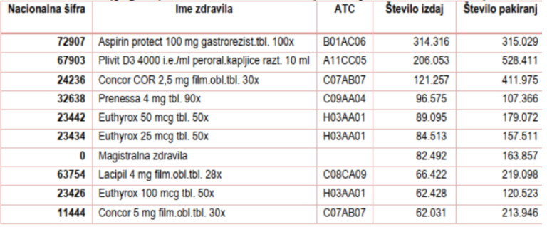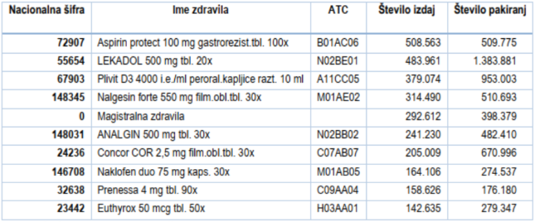 Po internih izračunih Lekarniške zbornice Slovenije, ki jih vodijo po podatkih Zavoda za zdravstveno zavarovanje Slovenije, je seznam desetih najpogosteje izdanih zdravil v letu 2020 naslednji.