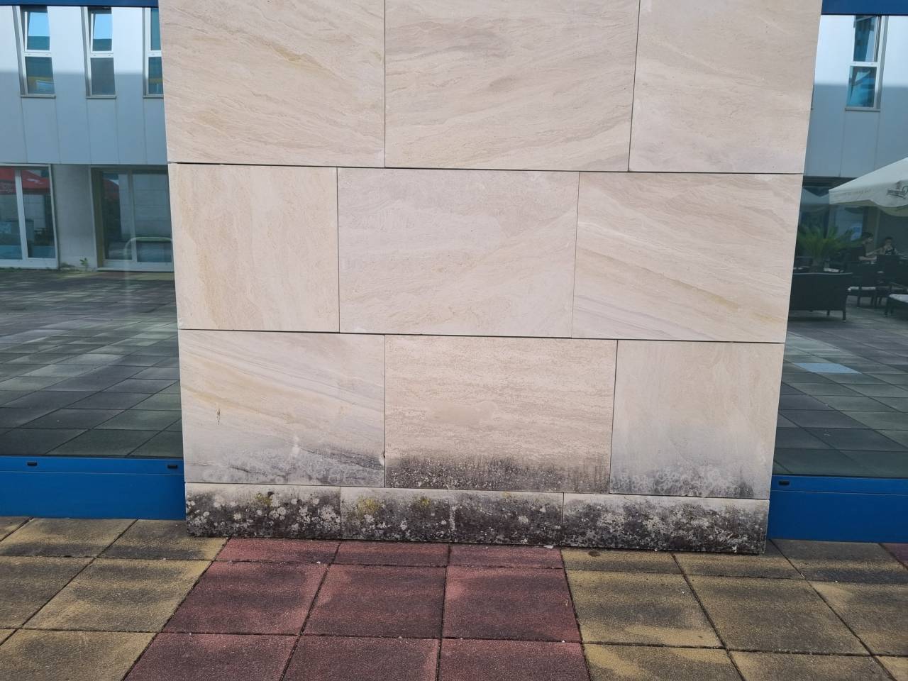 Kot so v poročilu ugotovili strokovnjaki, so bili namreč v preteklosti na fasadnih ploščah izvedeni neuspešni posegi čiščenja bioloških organizmov in grafitov, ki so povzročili poškodbe kamnitih fasadnih plošč, ker niso upoštevali načina izvedbe fasade in s tem povezanih prekoračitev natezne napetosti kamna pri obremenitvah pravokotno na smer fasade.
