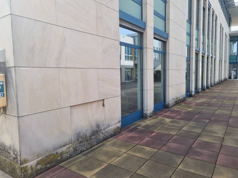 Zunanja podoba osrednje knjižnice v središču mesta je bila že večkrat na udaru. Ko niso na delu vandali s svojimi 'umetninami', pa udari narava in nepravilni poskusi čiščenja, ki naredijo več škode kot koristi.