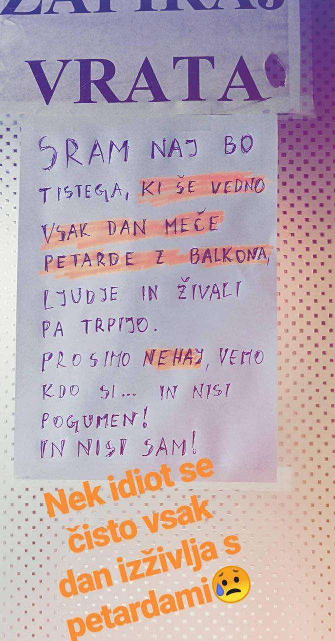 "Sram naj bo tistega, ki še vedno vsak dan meče petarde z balkona, ljudje in živali pa trpijo. Prosimo nehaj, vemo kdo si... In nisi pogumen! In nisi sam!," so zapisali na list papirja.