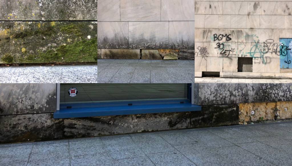- zamenjavo poškodovanih kamnitih plošč z enakim oziroma podobnim kamnom v spodnjem delu fasade,
