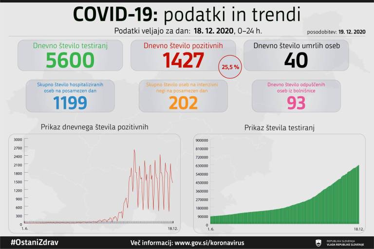 V Sloveniji so včeraj, 18. decembra, opravili 5600 testiranj na koronavirus in potrdili 1427 novih okužb. To pomeni, da je bil delež pozitivnih testov tokrat 25,5-odstoten.