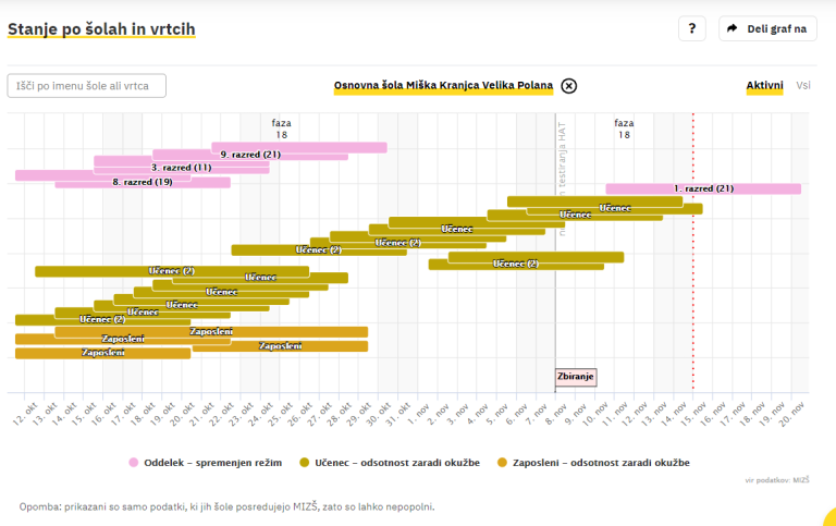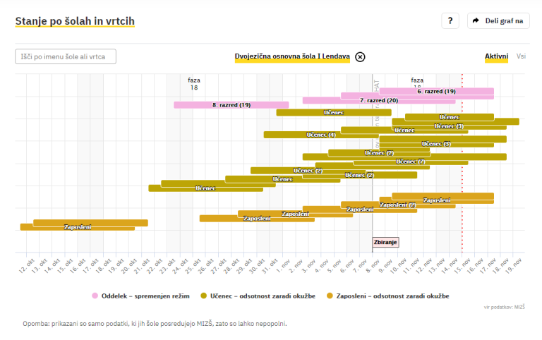 V šolo se danes vrača oddelek 9. razreda. V času od 5. do 14. novembra je zaradi potrjene okužbe pri učencu v karanteni bilo 20 oseb, vrača pa se tudi oddelek 4. razreda, v karanteni je bilo 22 oseb.