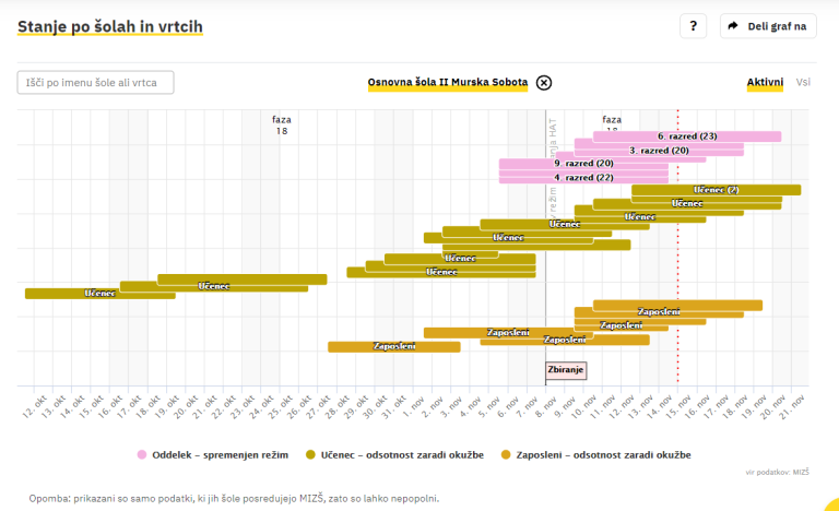 Covid-19 sledilnik redno objavlja podatke o okužbah, sumih na okužbo in karantenah v slovenskih osnovnih in srednjih šolah ter vrtcih. Izpostavljamo pomurske šole, pri katerih so v karanteni celotni oddelki, pouk pa poteka na daljavo.