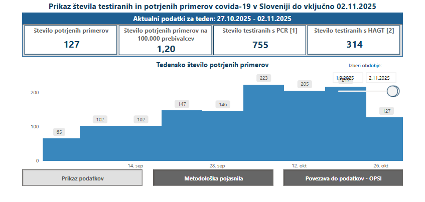 Po podatkih Nacionalnega inštituta za javno zdravje je bilo med 27. oktobrom in 2. novembrom 2025 v Sloveniji potrjenih 127 primerov okužb.