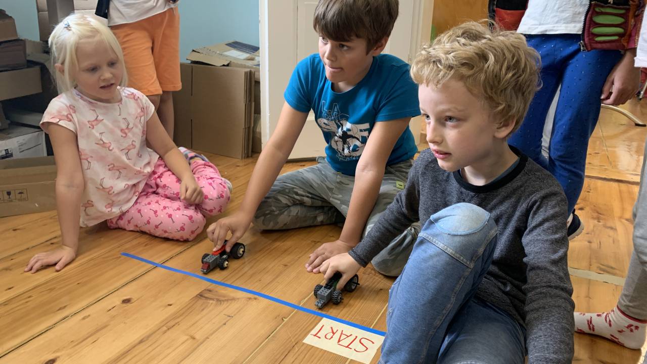 Sestavljanju avtomobilčkov je sledil preizkus hitrosti na pravem testnem poligonu in vzkliki: »Tri, štiri, zdaj! Tooo!«