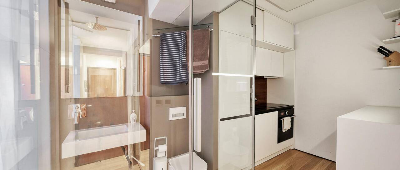 Ob tem lahko opazimo, da »odlično izkoriščena kuhinja« vključuje tudi to, da lahko potek kuhanja spremljaš kar z WC školjke, saj je videti, da so se odločili, da v »izjemno funkcionalni garsonjeri« kopalnico obdajo kar s prozornim steklom.