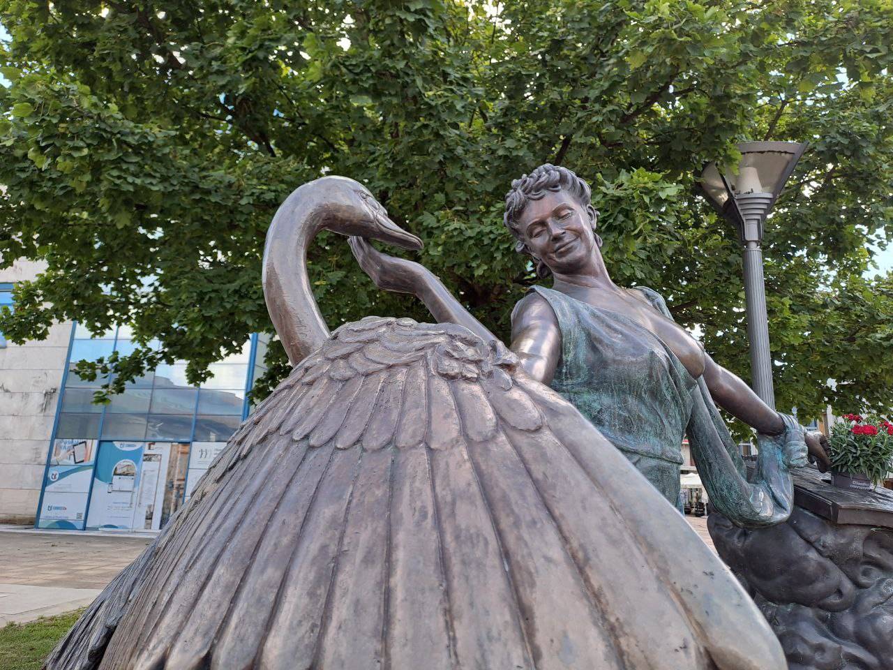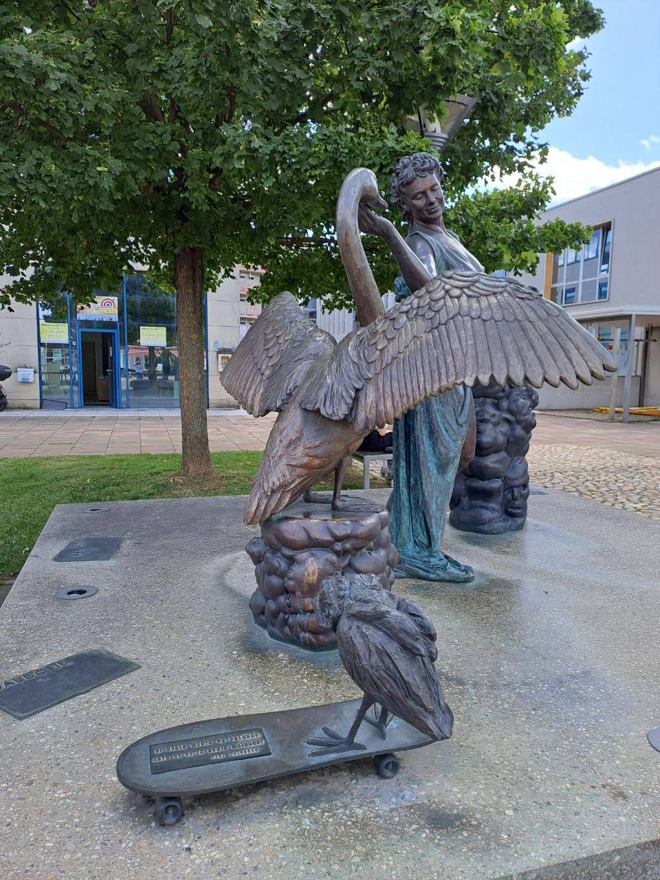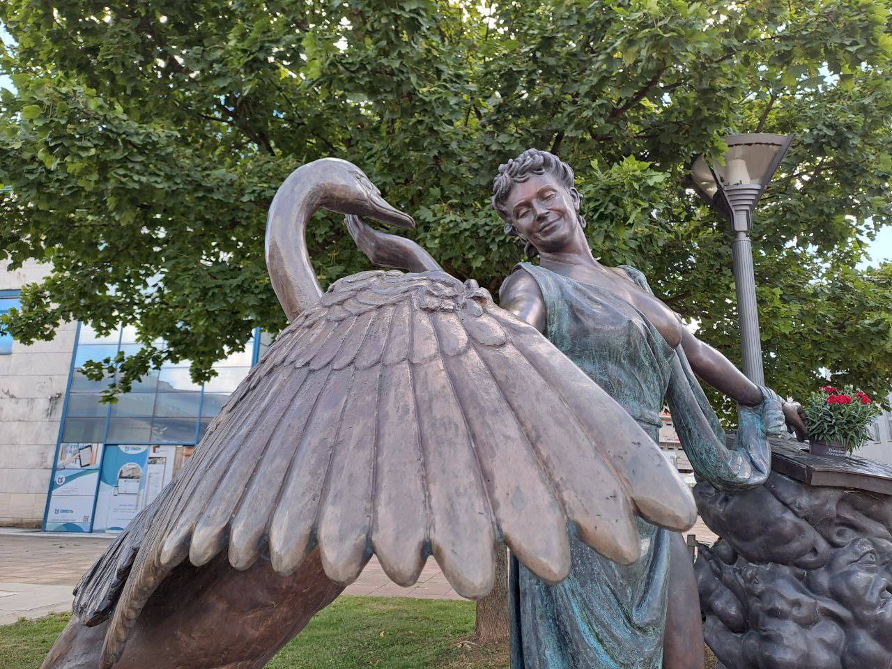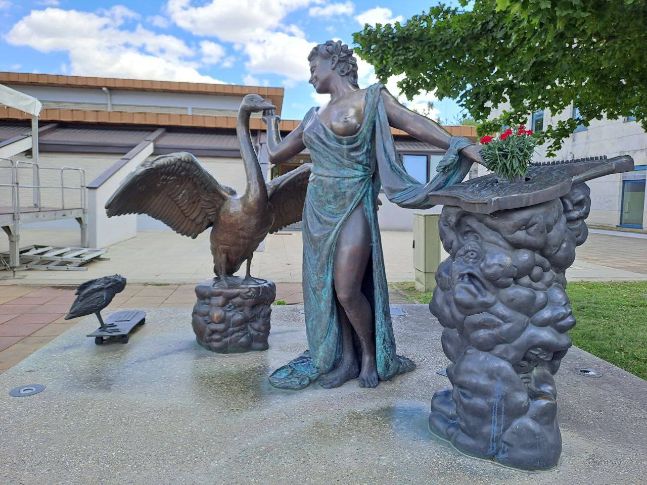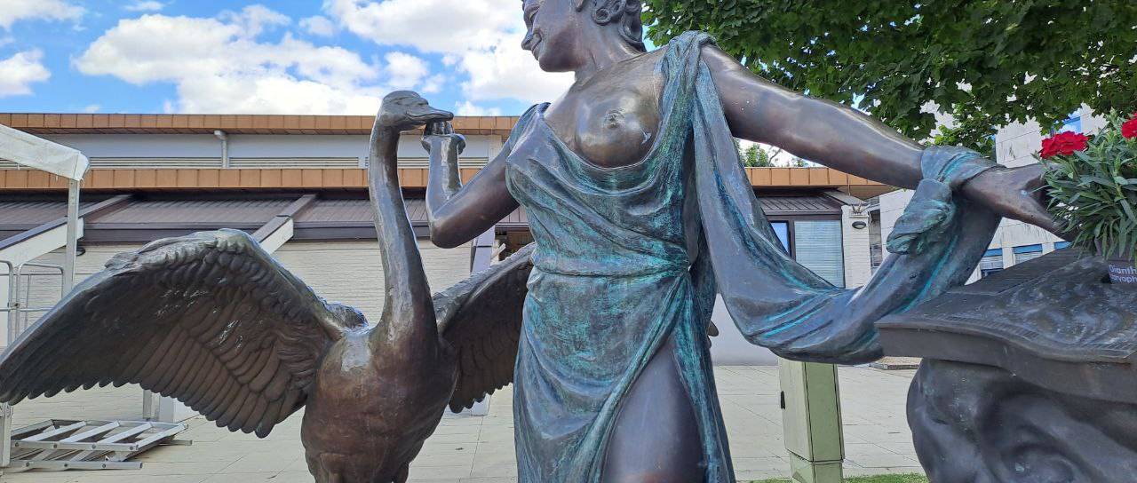 Kip je delo akademske kiparke Irene Brunec Tébi in prikazuje muzo z njenima značilnima atributoma, citrami in labodom.
