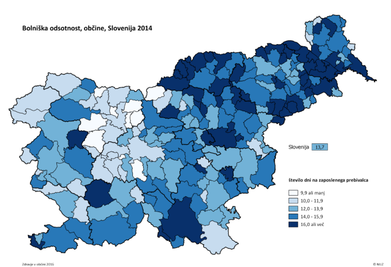 Največ bolniških odsotnosti zaposlenih je v občinah Grad, Gornji Petrovci, Lendava, Beltinci, Črenšovci, Tišina, Apače, Gornja Radgona, Radenci, Sveti Jurij, Križevci, Veržej, Ljutomer in Razkrižje. Število bolniških odsotnosti v teh občinah znaša šestnajst dni ali več.