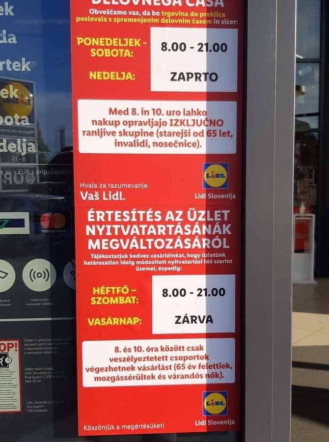 Pod obvestilom o delovnem času in času nakupovanja ranljivih skupin v slovenščini je namreč bilo še tovrstno obvestilo v madžarskem jeziku. Na to so nas opozorili tudi naši bralci, ki so se upravičeno spraševali, komu služi zapis v madžarščini, saj vendarle Murska Sobota ni dvojezično območje.