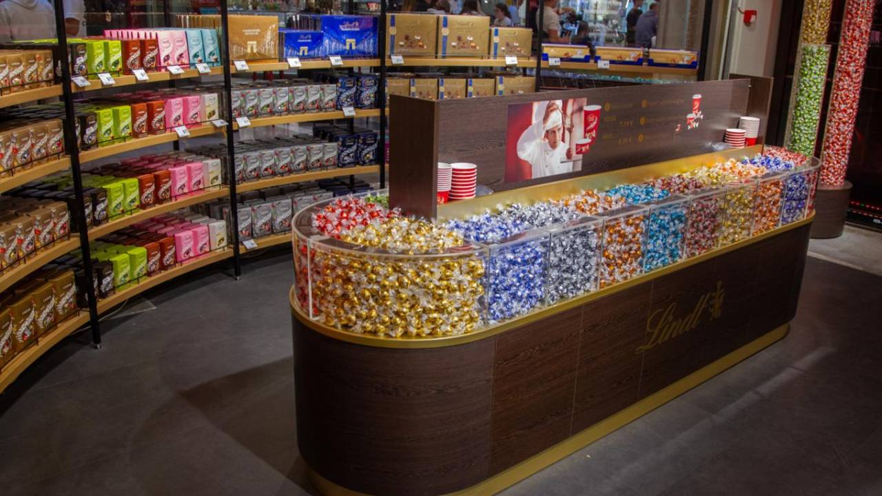 V trgovini lahko opazimo široko paleto luksuznih čokolad Lindt, vključno s čokoladnimi tablicami, pralinami in bonbonierami.