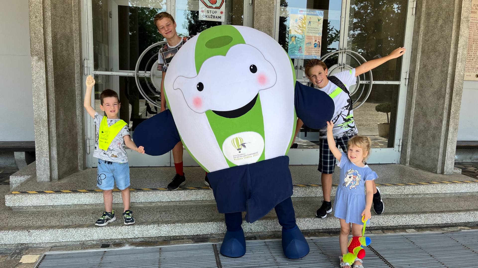 Mali Štrkec, maskota letošnjega Svetovnega prvenstva v letenju s toplozračnimi baloni, pospremil otroke v šolo na prvi šolski dan.