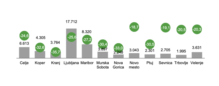 Sledijo območna služba Ptuj, območna služba Kranj, območna služba Maribor, območna služba Velenje, območna služba Celje, območna služba Ljubljana, območna služba Koper, območna služba Nova Gorica, območna služba Novo mesto, območna služba Trbovlje ter območna služba Sevnica, kjer se je brezposelnost zmanjšala najmanj.