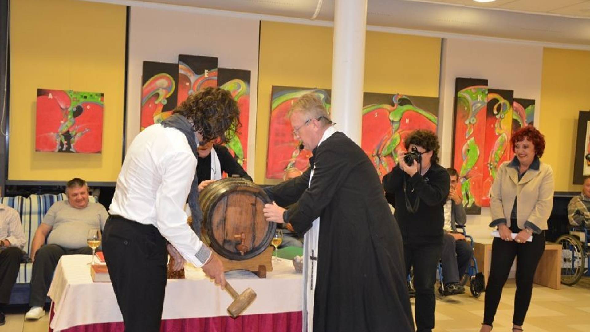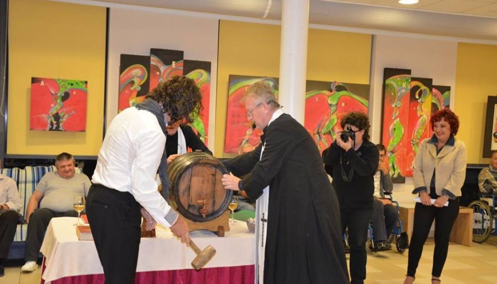 Otvoritev razstave se je nadaljevala z za obiskovalce izjemno atraktivnim krstom mošta. Po obredu so imeli obiskovalci možnost poizkusiti mlado vino.