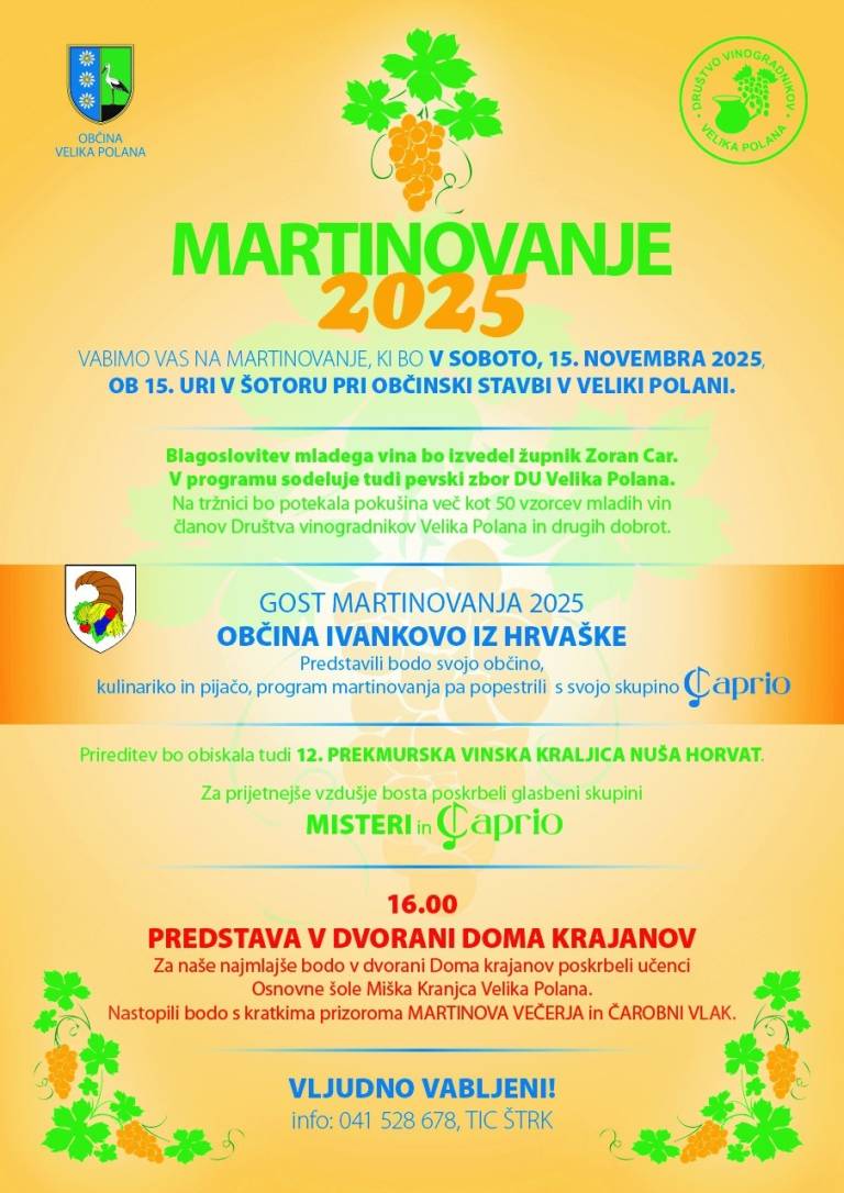 V Veliki Polani bo v soboto, 15. novembra 2025, potekalo tradicionalno Martinovanje 2025, ki ga pripravlja Društvo vinogradnikov Velika Polana v sodelovanju z občino Velika Polana.