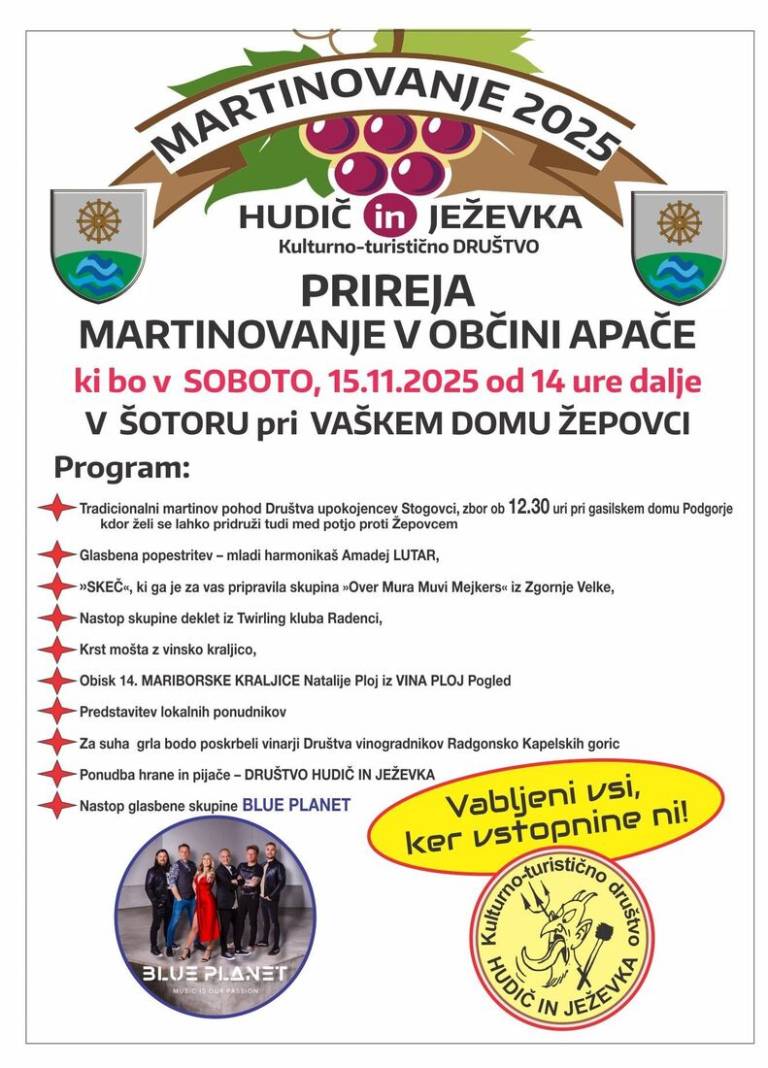 Kulturno-turistično društvo Hudič in Ježevka vabi vse ljubitelje vina, dobre glasbe in druženja na martinovanje v soboto, 15. novembra 2025, z začetkom ob 14. uri v šotoru pri vaškem domu Žepovci.