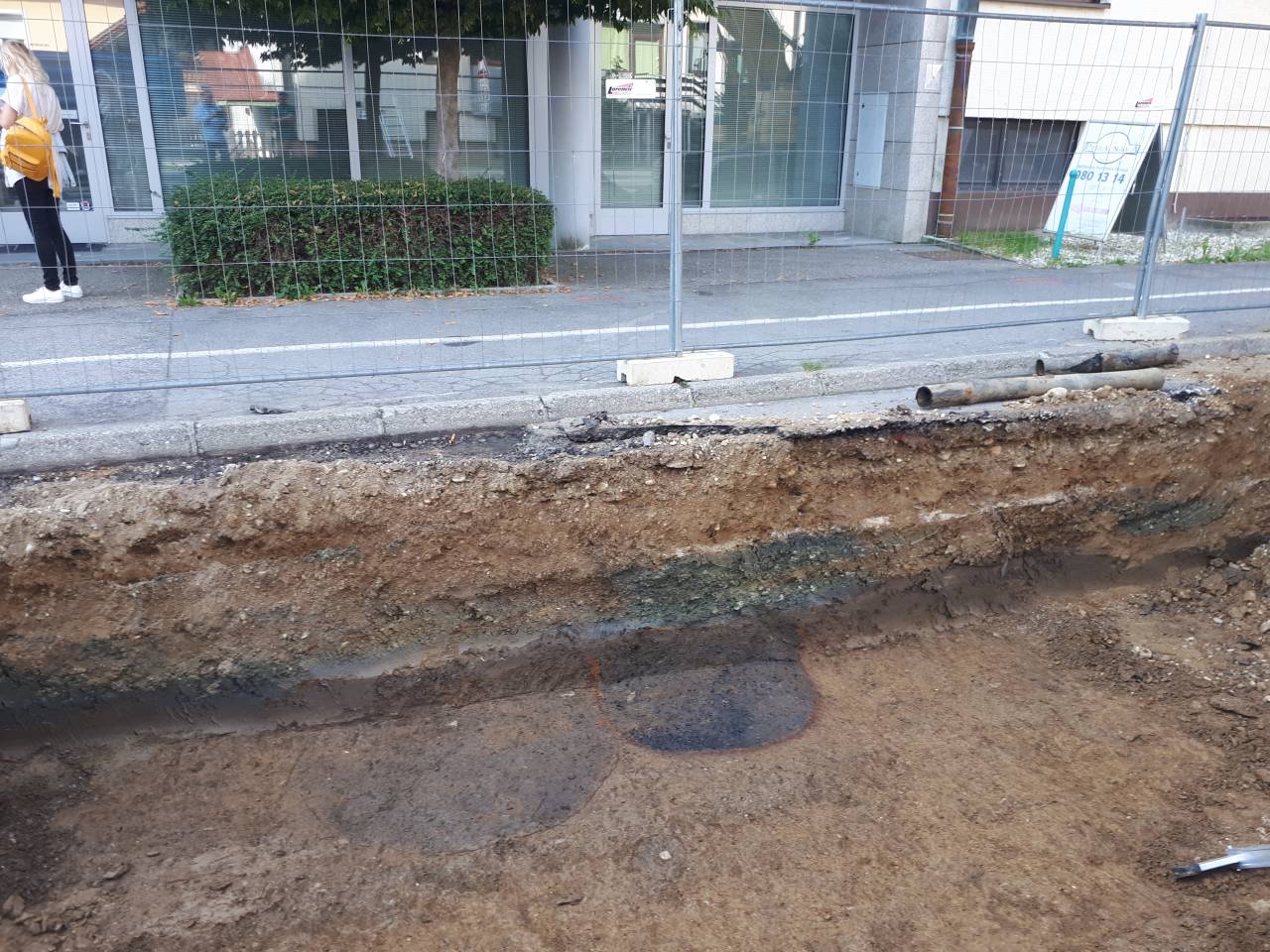 V profilu izkopa se lahko vidi izgradnja ceste v preteklosti, torej dve plasti ceste. Vse srednjeveške strukture pa so se pojavile na globini enega metra, v temno rjavi plasti, nad katero je bila naplavina.